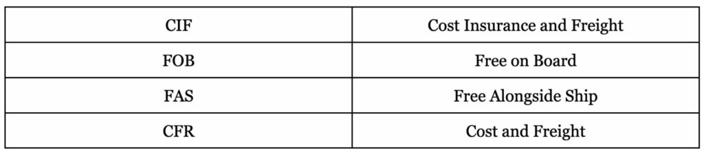These Incoterms cover aspects that are related to shipments through the sea and waterways only. For example, the term CIF denotes that the seller is responsible for delivering the goods on the vessel at the shipment port after export clearance.